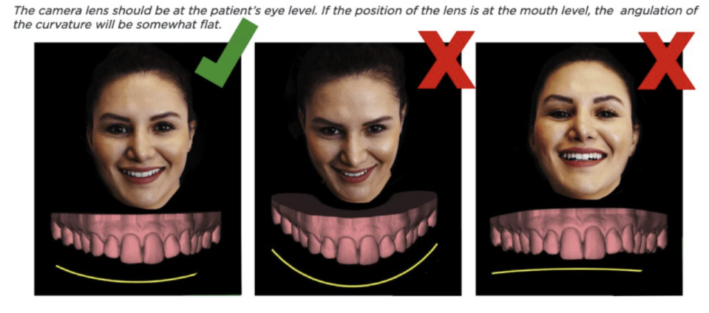To prevent distortions on the smile curve of the patient’s current conditions, level the camera’s lens to your patient’s eyes and ensure that your camera is straight. Looking at the camera’s lens, ask your patient to give a wide smile with their mouth slightly open for the picture to be taken with a.i. technology.