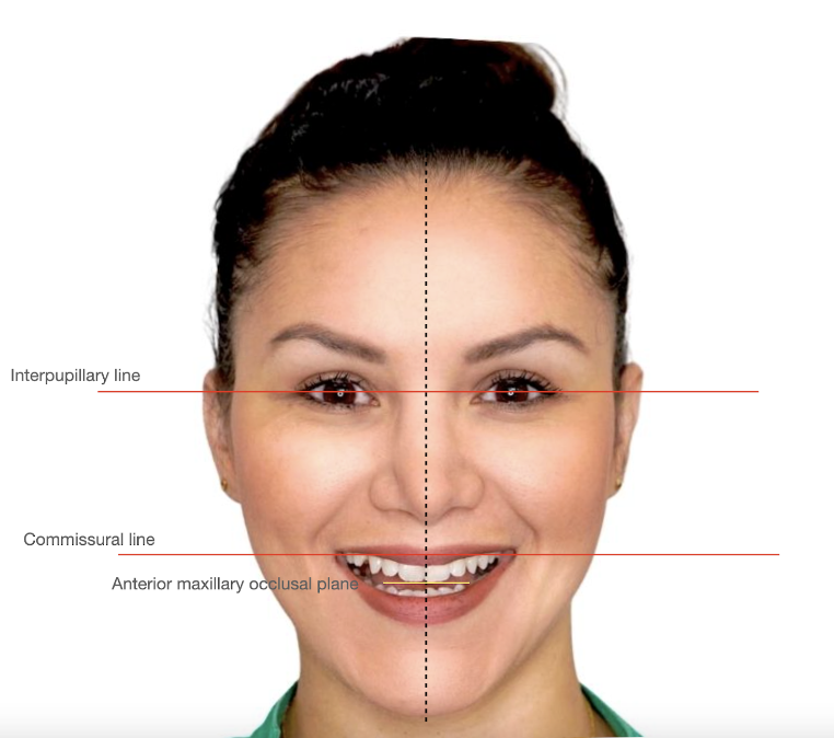- The interpupillary line should be perpendicular to the midline of the face and parallel to the occlusal plane from an anterior view