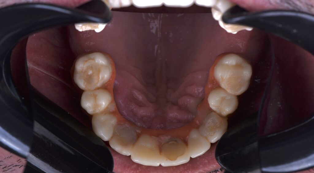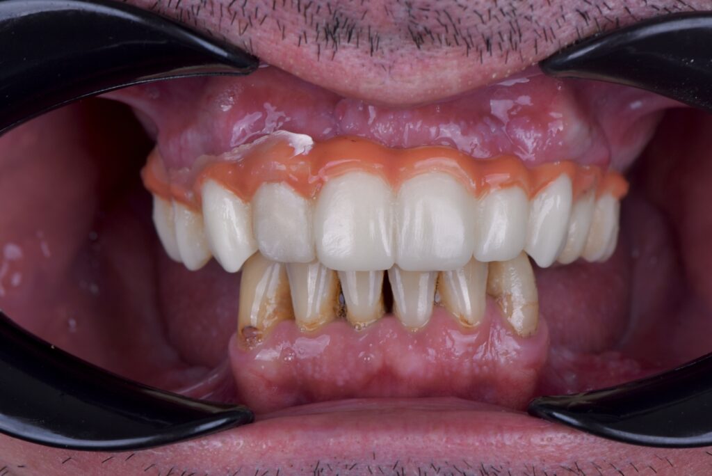 Although a full-mouth rehabilitation using a full upper screw-retained bridge over implants and single crowns over implants on the lower posterior arch, the patients first chose to start with the upper arch.