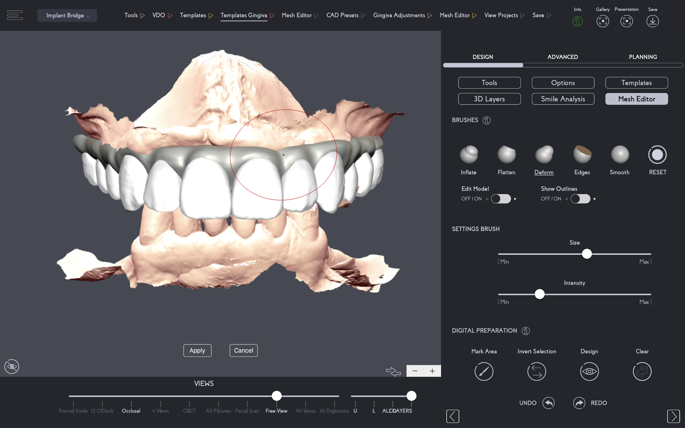 With the teeth template in place, the artificial gingiva is added with one click and customized in the mesh editor feature.