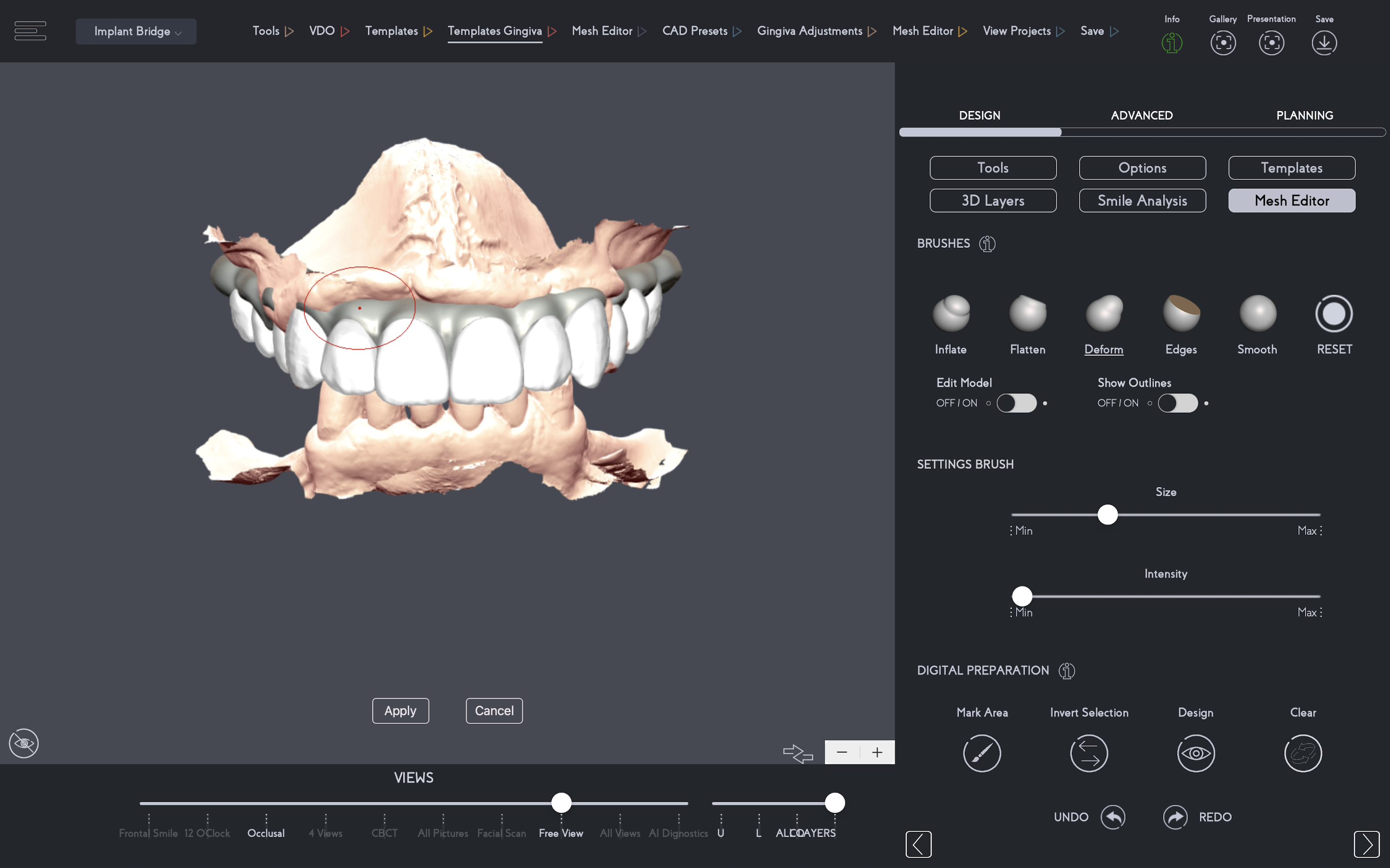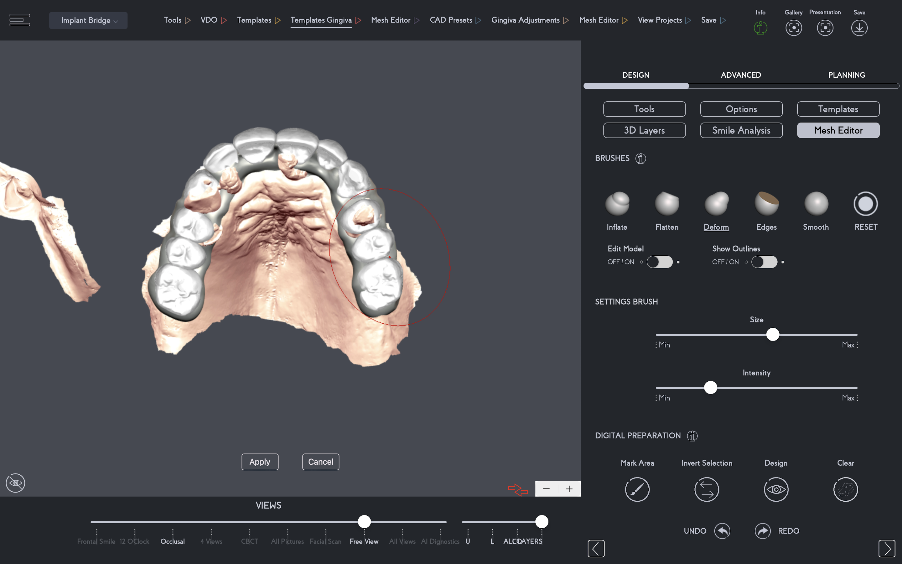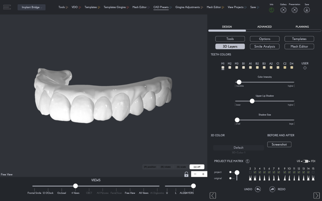 In this stage, the dental professional can customize the dental bridge esthetics to boost the communication between the dentist and lab technician regarding gingival contouring, palatal base, and more, as well as to pre-plan the position of implants according to the patient's arch form and treatment planning when sending the implant bridge design to an implant planning software.