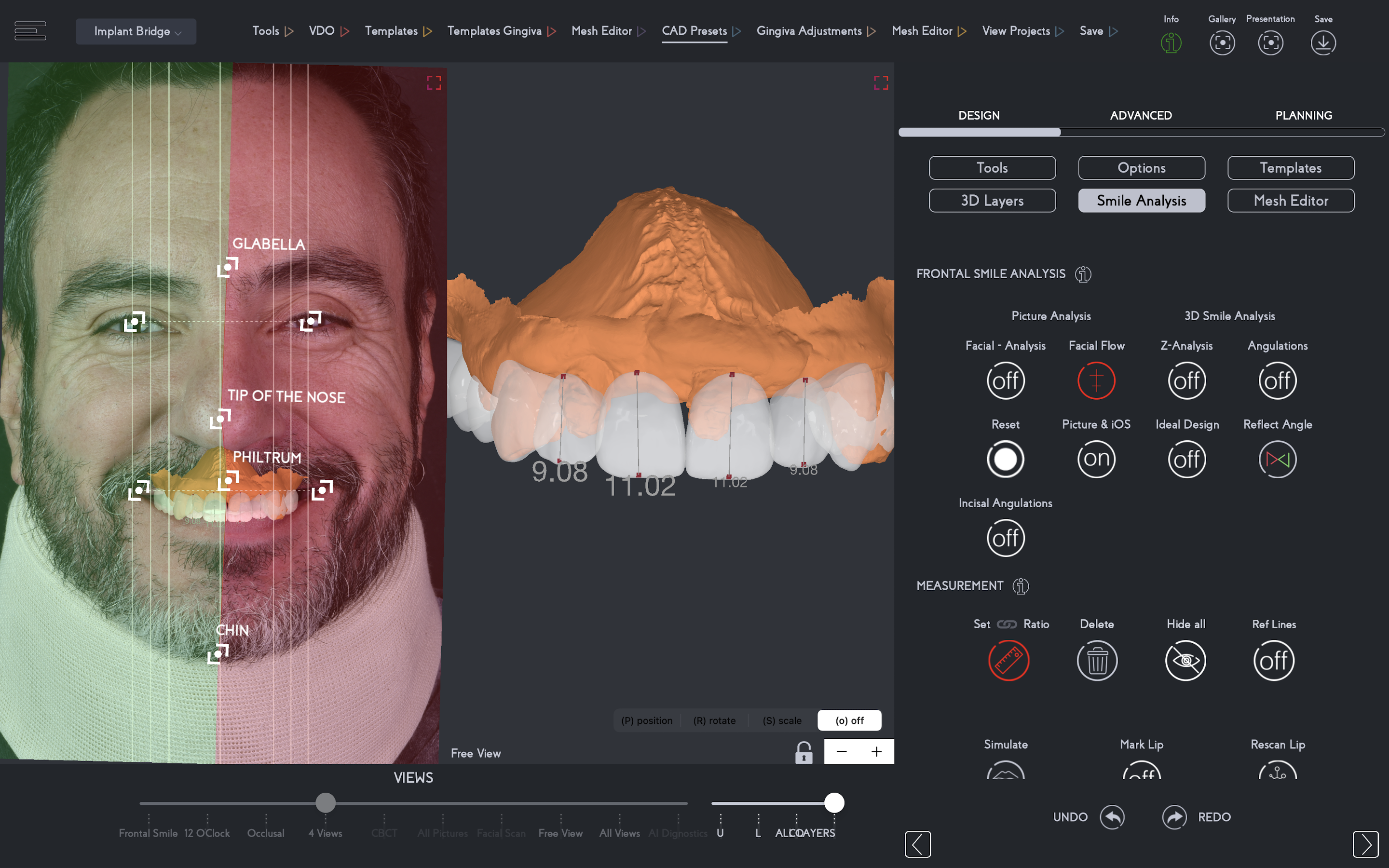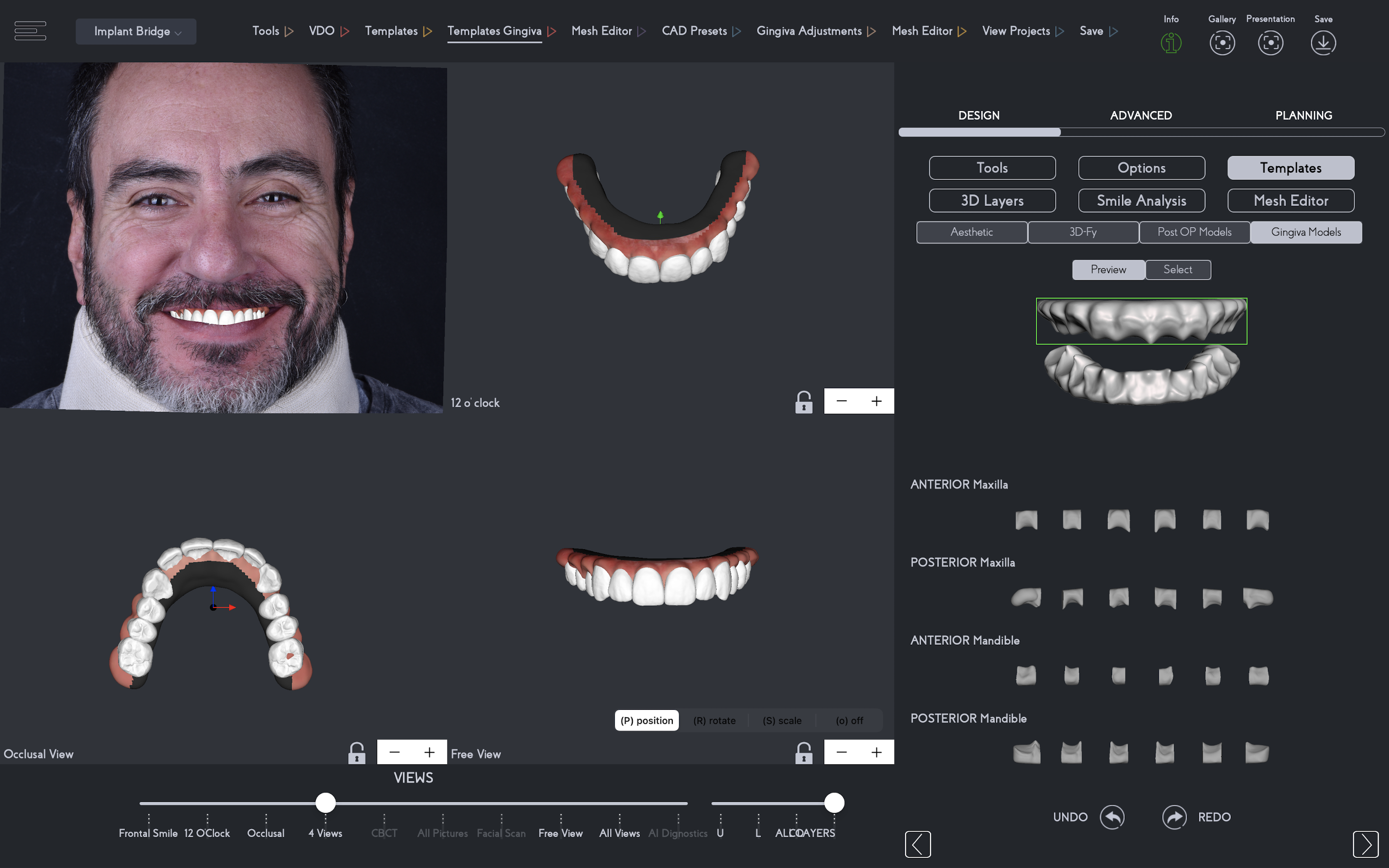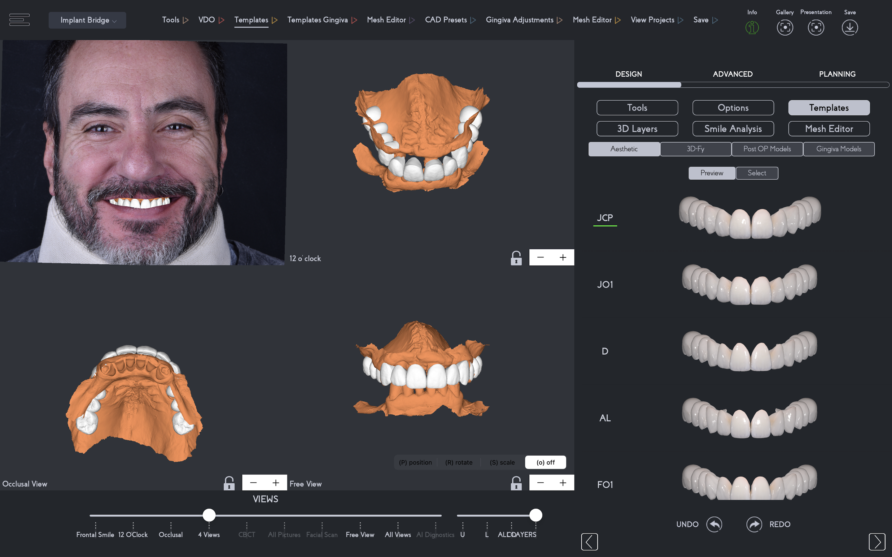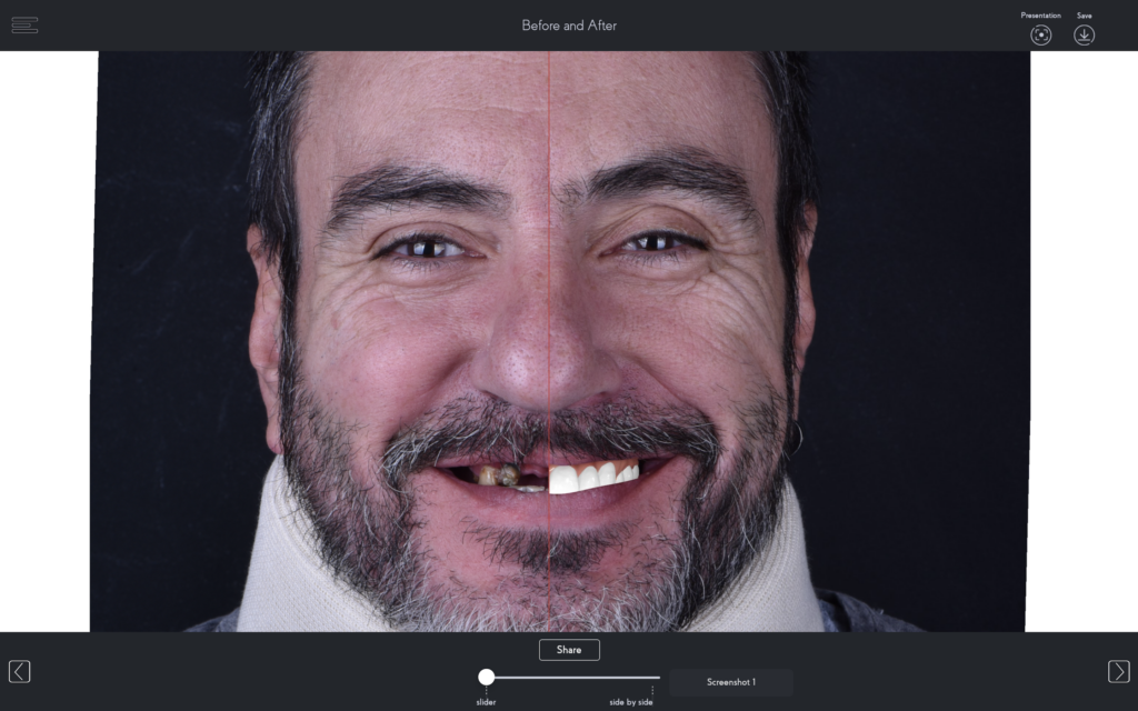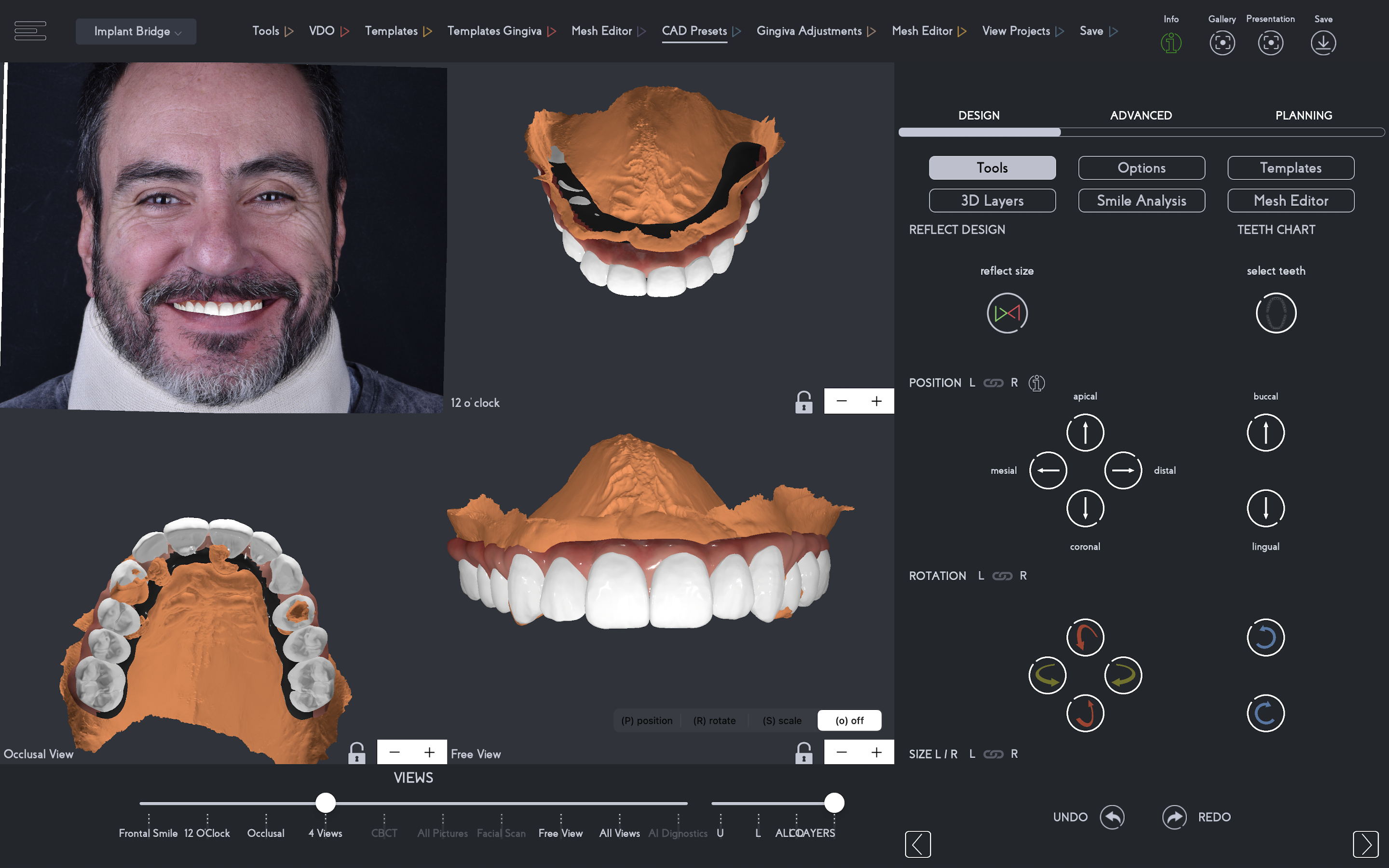 The software allows dentists to superimpose the patient’s photograph and digital casts to digitally pre-design the implant bridge while evaluating teeth contour, smile curvature, and proportions, facilitating communication between the interdisciplinary team and patient towards a more incredible rehabilitative therapy and predictable outcome.