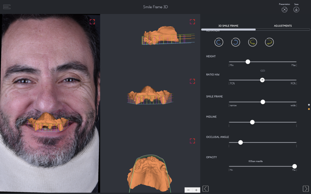 With the files calibrated, the automated 3D smile frame allows the dentist to preset the proportions and position of the entire upper arch and occlusal angulation virtually, which can be fully customized according to the patient’s palate form, interocclusal space, and planning.