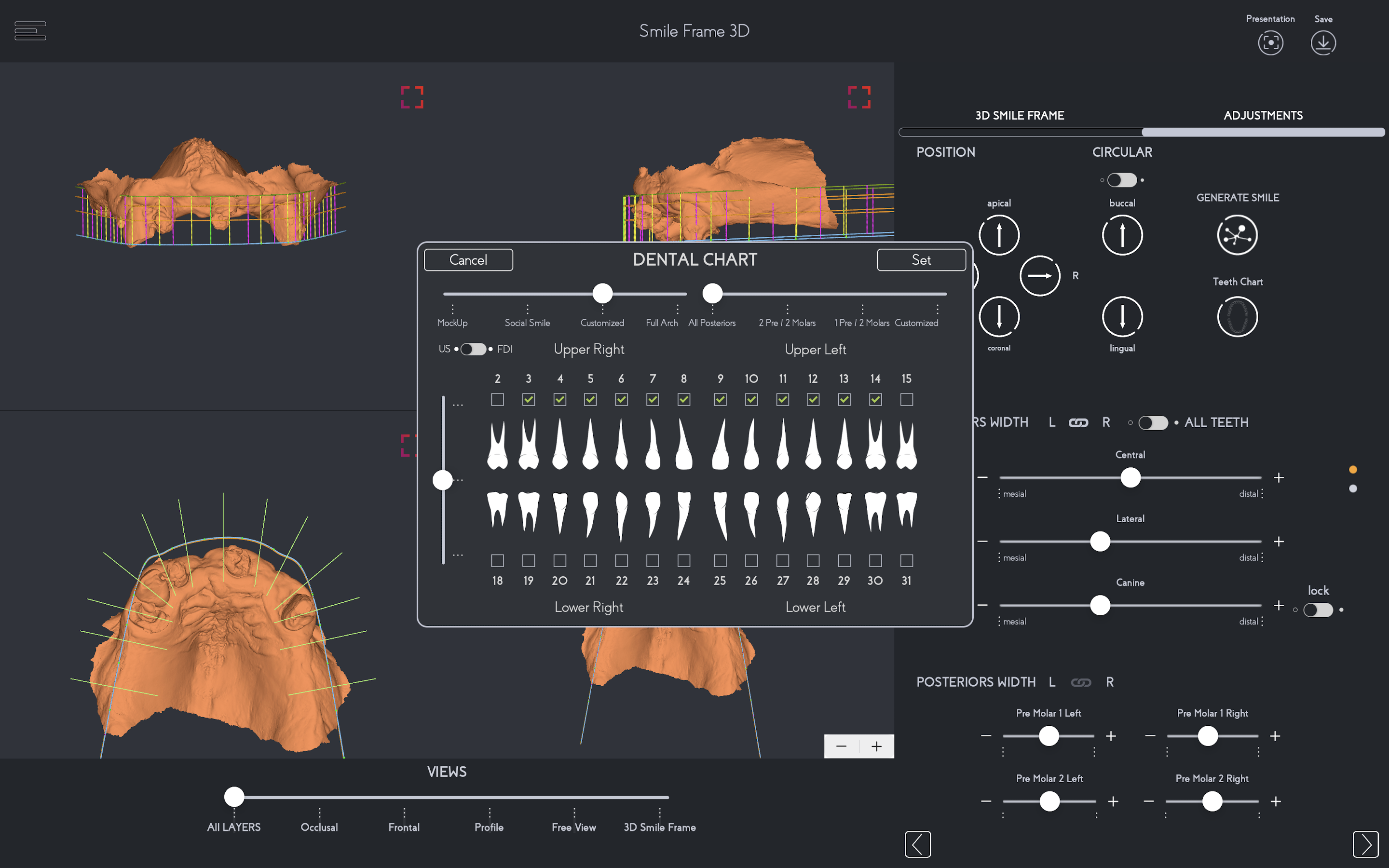 Once the 3D frame is preset, the dental professional can select how many units will be added to the dental bridge, and the 3D teeth templates will automatically appear according to the smile frame setup.