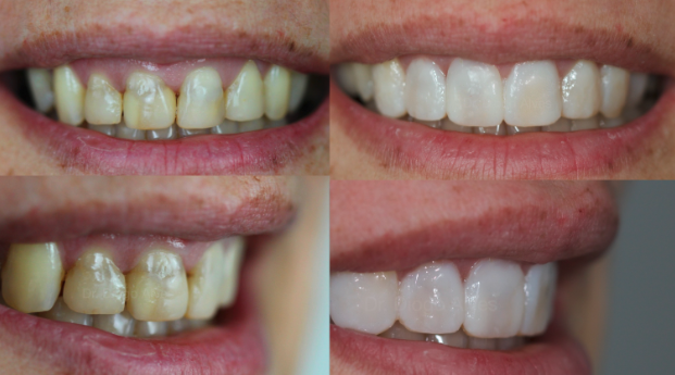 An aesthetic analysis showed the necessity to reshape the teeth’ form, correct uneven gingival margins, and whiten the teeth by changing old composite restorations and replacing them with crowns and veneers.